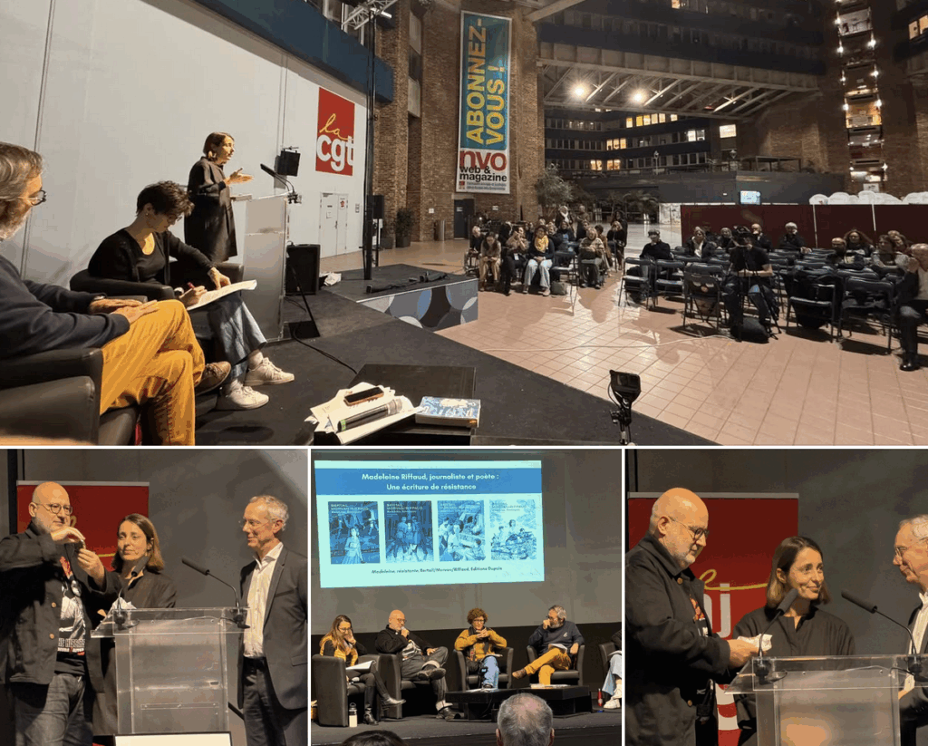 Hier soir, Madeleine Riffaud recevait la médaille d’honneur de la CGT, des mains de Sophie Binet, pour son travail de journaliste dans La Vie Ouvrière, mais pas que. Elle l’avait acceptée mais était trop faible pour qu’elle lui soit remise l’an dernier. Ce n’est donc pas une médaille obtenue à titre posthume, même si c’est Philippe Denimal et moi qui l’avons récupérée pour elle.